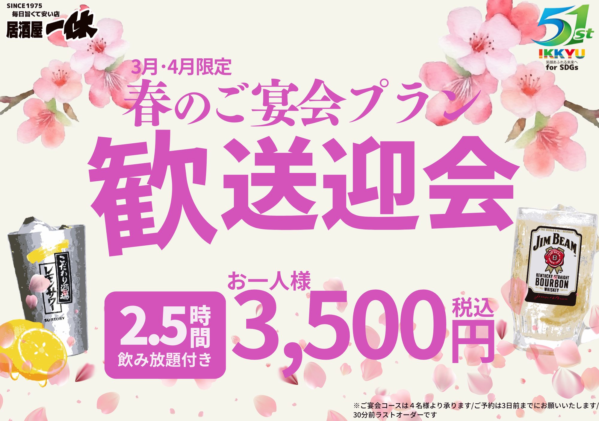 春のご宴会におすすめ 歓送迎会コースのご案内 出会いと旅立ちの季節。 一休では、歓送迎会にぴったりの春のご宴会プランをご用意しました。 お料理とお酒をゆっくり楽しめる 2.5時間飲み放題付きの特別コースです。 職場の送別会・歓迎会はもちろん、 友人同士の春の集まりにもぜひご利用ください。 ■ コース内容 歓送迎会コース ・お一人様 3,500円(税込) ・2.5時間飲み放題付き ■ ご利用条件 ・4名様より承ります ・ご予約は3日前までにお願いいたします ・ラストオーダーは 30分前となります ■ご予約限定特典 ・日~木曜日限定、30分飲み放題延長無料(祝前日を除く) ・12様以上のご予約で幹事様1名様分無料 春のご宴会はぜひ一休で。 皆さまのご予約・ご来店を心よりお待ちしております。