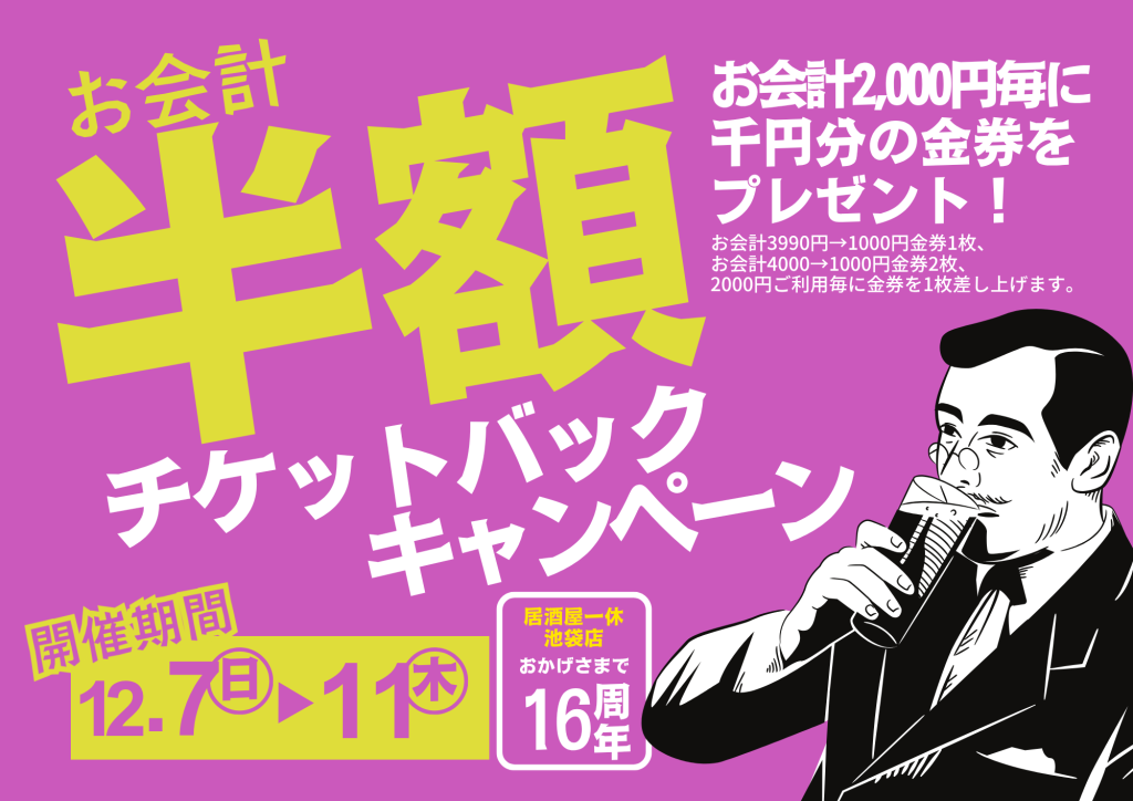 2025年12月池袋店はおかげさまで41周年を迎えます🙌 周年を記念して感謝祭を開催♪ 12月7日(日)~11日(木)まで 「お会計半額チケットバックキャンペーン」 ・グループ全員が一休会員である事が条件となります(当日入会可) ・金券は翌来店日よりお一人様につき1枚ご利用いただけます ・金券の有効期限は2026年2月28日まで ・お会計金額が2,000円以上で1,000円の金券を1枚、+2,000円ご利用毎に1枚ずつ差し上げます (例)2,000円=1枚 / 3,999円=1枚 / 4,000円=2枚 / 6,000円=3枚・・・ 「全てのお客様に感謝の気持ちを込めて・・・」 ぜひお得な期間中にご来店ください!