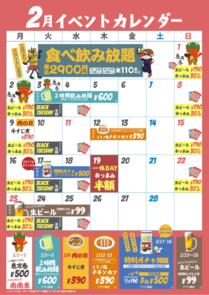 2月も居酒屋一休はイベント盛りだくさんで皆様のご来店をお待ちしております。