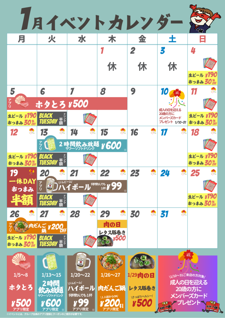 2026年も居酒屋一休はイベント盛りだくさんで皆様のご来店をお待ちしております。 【新宿歌舞伎町店のみ曜日別サービス、19日一休デーのサービスの適用はございません】 アプリ登録条件サービスが多数ございますので、この機会に是非お得な一休アプリのご登録をお願いいたします。 https://193.co.jp/izakaya/topics/3891/