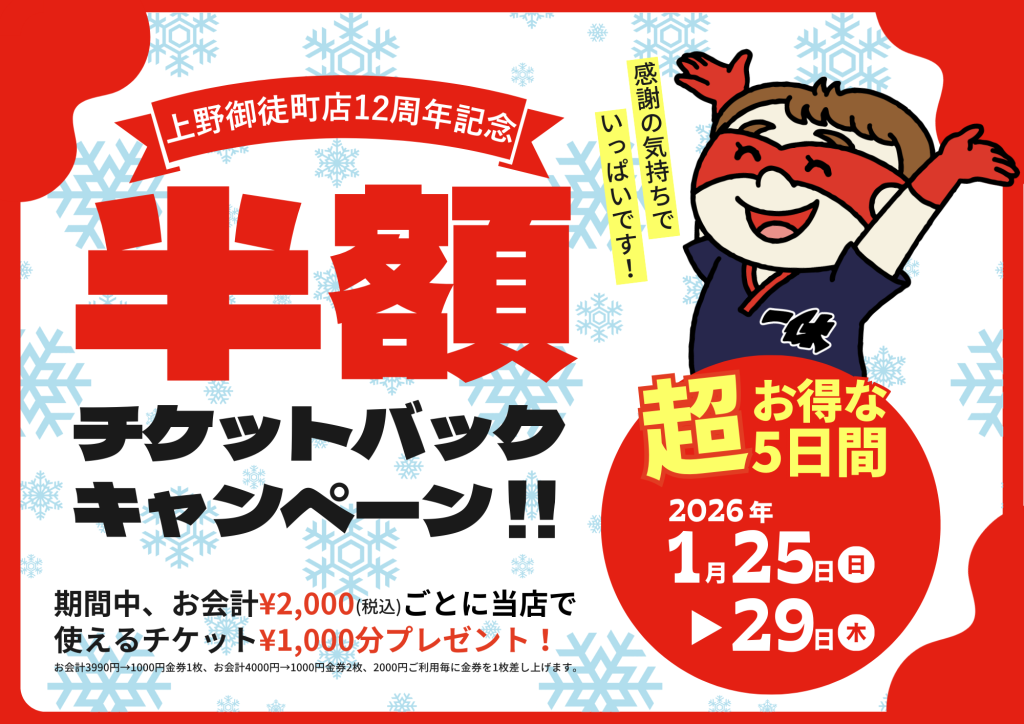2026年1月新宿歌舞伎町店はおかげさま12周年を迎えます🙌 周年を記念して感謝祭を開催♪ 1月25日(日)~29日(木)まで 「お会計半額チケットバックキャンペーン」 ・グループ全員が一休会員である事が条件となります(当日入会可) ・金券は翌来店日よりお一人様につき1枚ご利用いただけます ・金券の有効期限は2026年2月28日まで ・お会計金額が2,000円以上で1,000円の金券を1枚、+2,000円ご利用毎に1枚ずつ差し上げます (例)2,000円=1枚 / 3,999円=1枚 / 4,000円=2枚 / 6,000円=3枚・・・ 「日頃からご愛顧いただいているお客様に感謝の気持ちを込めて・・・」 ぜひお得な期間中にご来店ください!