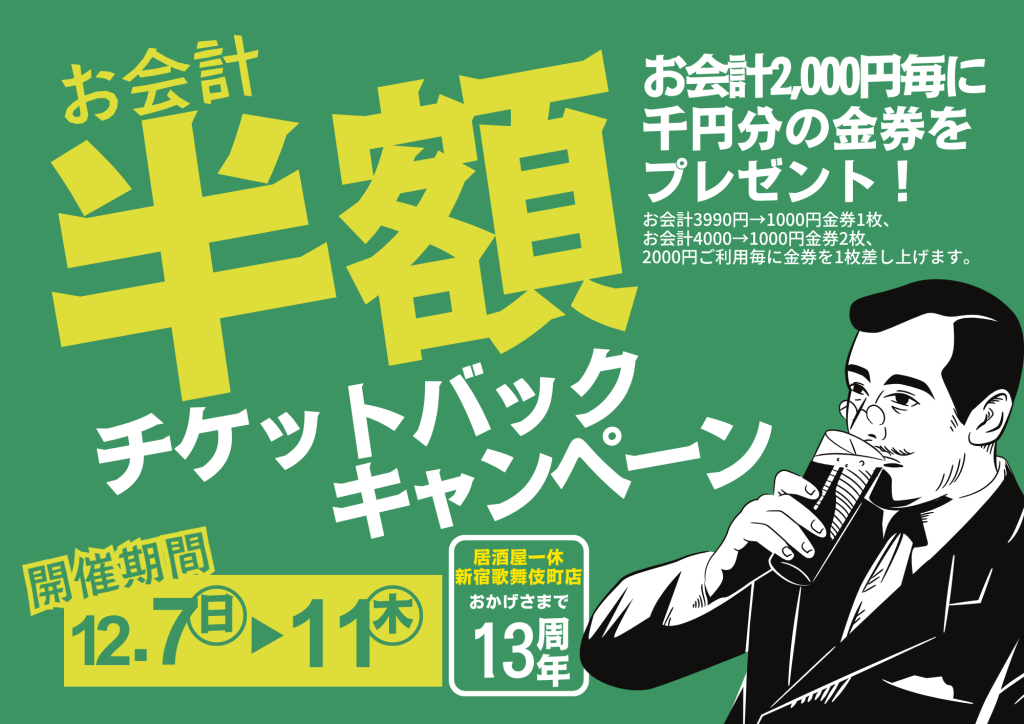 2025年12月新宿歌舞伎町店はおかげさまで41周年を迎えます🙌 周年を記念して感謝祭を開催♪ 12月7日(日)~11日(木)まで 「お会計半額チケットバックキャンペーン」 ・グループ全員が一休会員である事が条件となります(当日入会可) ・金券は翌来店日よりお一人様につき1枚ご利用いただけます ・金券の有効期限は2026年2月28日まで ・お会計金額が2,000円以上で1,000円の金券を1枚、+2,000円ご利用毎に1枚ずつ差し上げます (例)2,000円=1枚 / 3,999円=1枚 / 4,000円=2枚 / 6,000円=3枚・・・ 「全てのお客様に感謝の気持ちを込めて・・・」 ぜひお得な期間中にご来店ください!