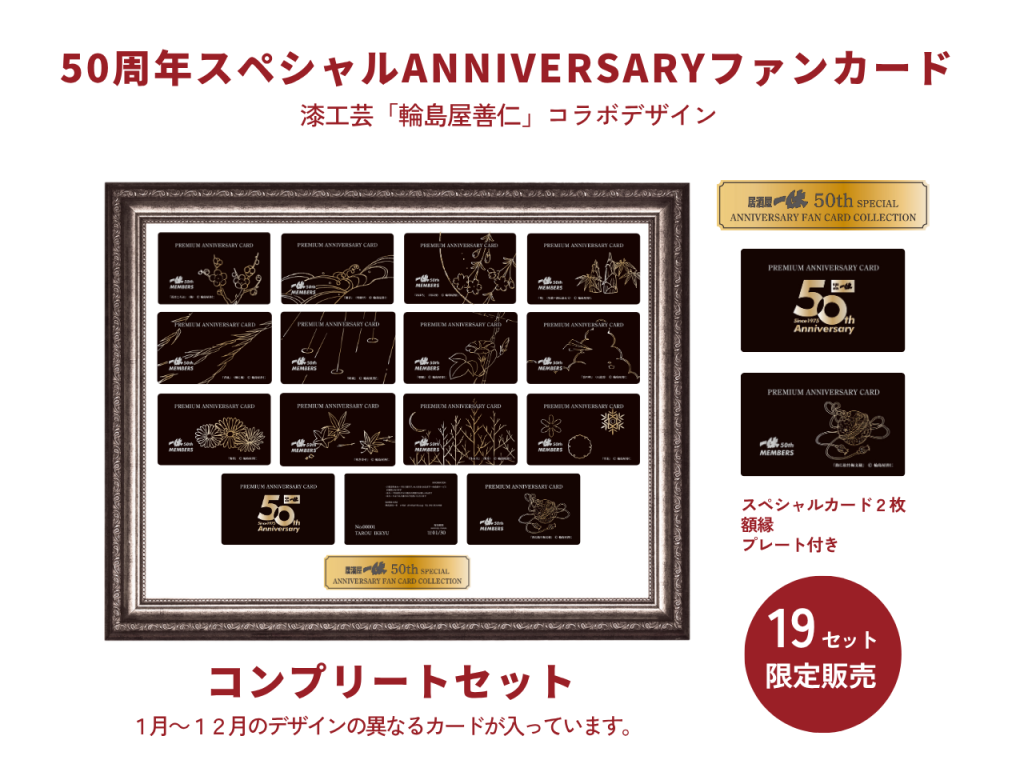 50周年を記念して1年間販売してきた「一休50周年スペシャルANNIVERSARYファンカード」 コンプリートセットを限定販売いたします。 輪島漆器工芸「輪島屋善仁」コラボデザイン、毎月異なる12テーマの絵柄に加え、 コンプリートセットだけで手に入るスペシャルカード2枚とプレートを額縁に飾った特別仕様。 すべてのカードにお客様の氏名と有効期限を印字してお送りいたします! ◆受注生産商品につき納品までお時間をいただきます。 ◆限定生産につき数に限りがございます。 ◆アプリ連携画像はスペシャルカードを含む14種類からお選びいただけます。 こちらのコンプリートセットをもっと詳しく知りたい方、購入されたい方は下記よりご確認ください ↓↓↓ https://www.advance19.com/products/detail/108
