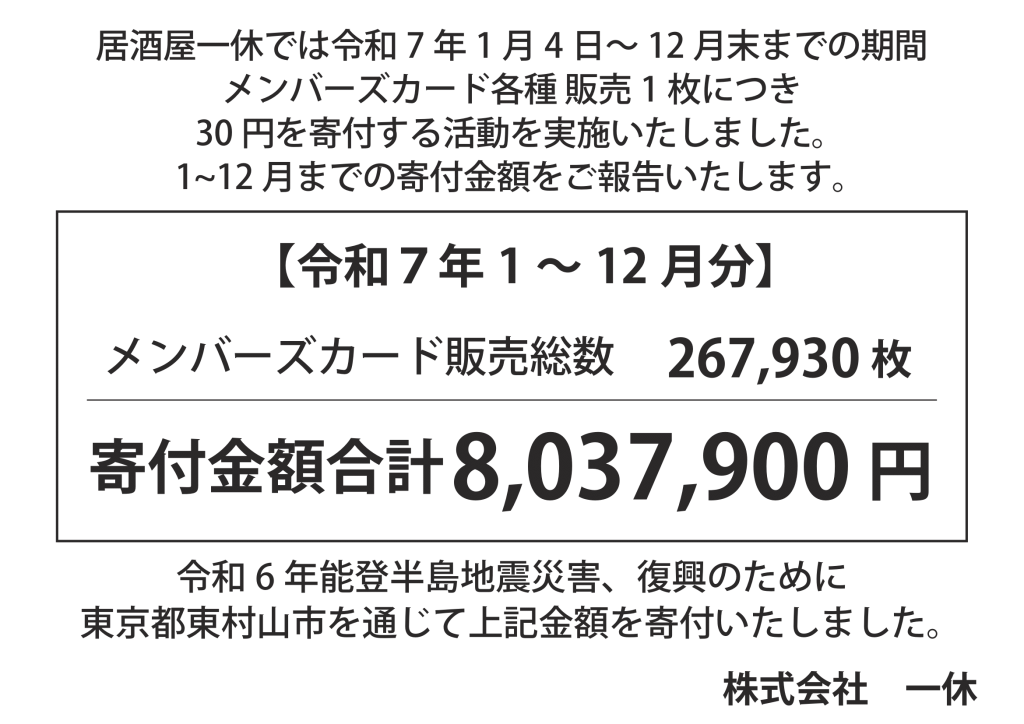 2025年1月~12月までの総額(1~12月までの販売総数) 2024年に引き続き多くの方に一休会員へご入会いただき、たくさんの寄付額を集める事が出来ました。 心より感謝申し上げます。 ~能登半島地震災害復興支援、メンバーズカードチャリティーキャンペーン概要~ 2024年1月1日(月)に能登半島で過去最大級となる地震が発生し、家屋の倒壊や津波による浸水被害などをもたらしました。 この度の能登半島地震により被災された地域の皆様に心よりお見舞い申し上げます。 この地震を受け、居酒屋一休では被災地支援の取り組みとして2025年12月末までの期間中 お客様の一休メンバーズカード(新規入会金330円)1枚に対して30円を東村山市を通し被災地に寄付させていただきました。